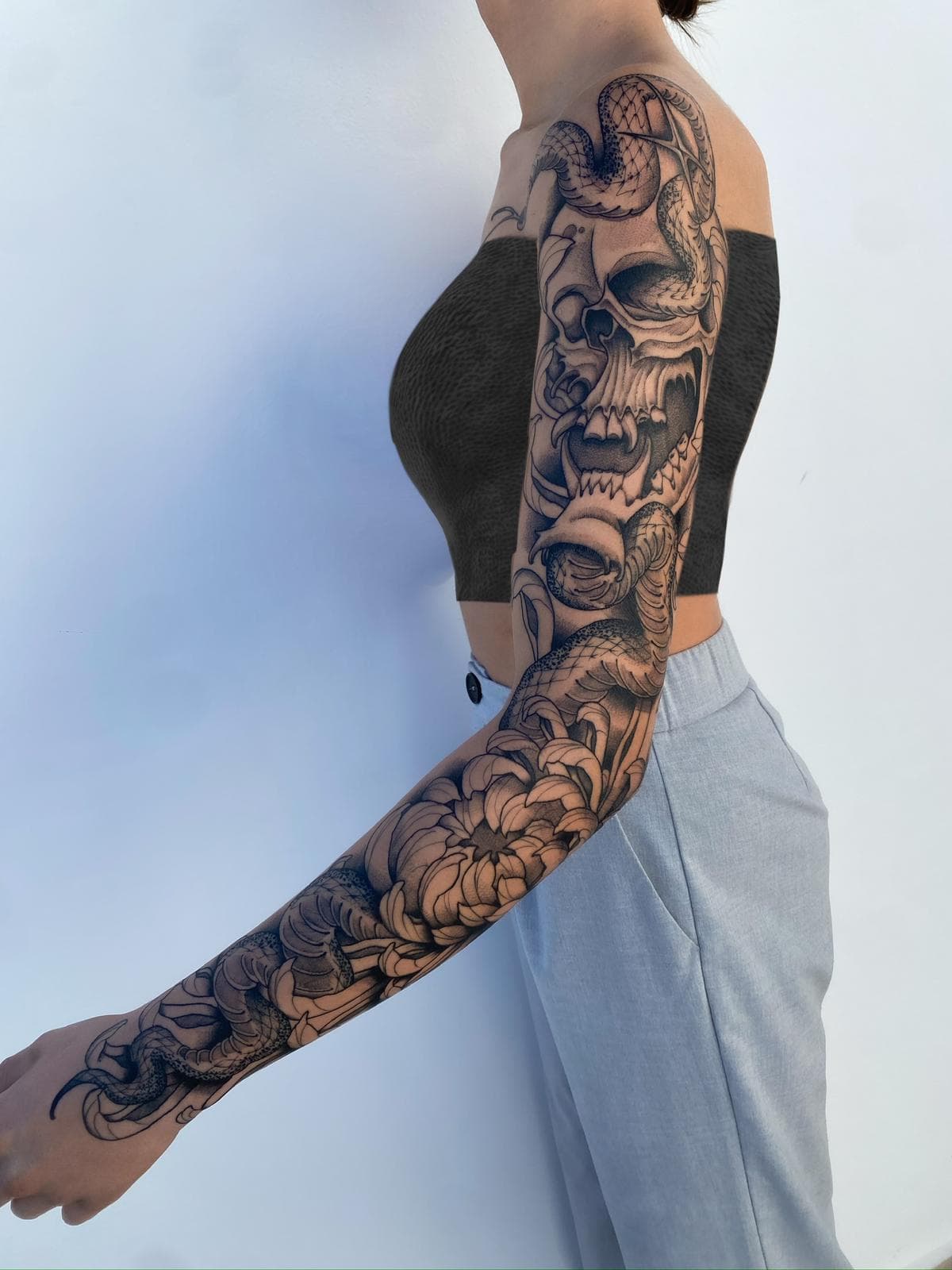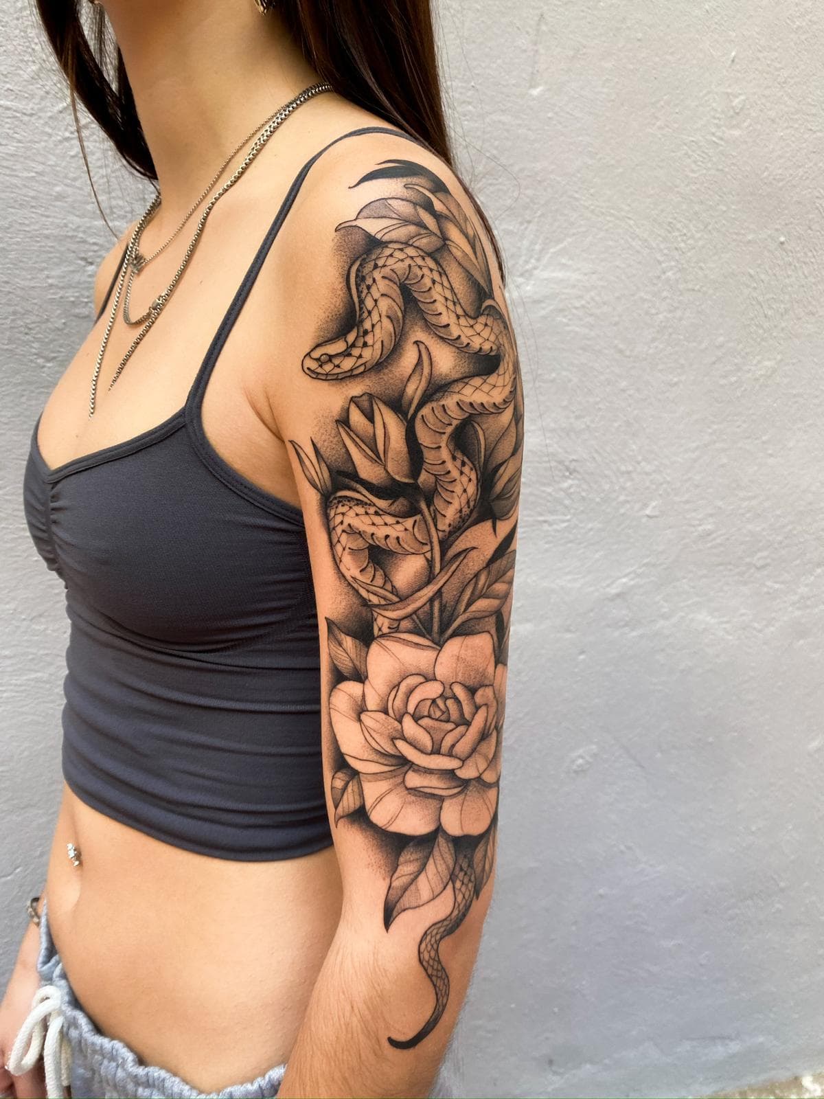 Bevorzugte Stile: Sein Stil kombiniert Elemente des Realismus mit surrealen und mythologischen Motiven, oft ergänzt durch eine dramatische Black-and-Grey-Ästhetik, die kraftvolle und ausdrucksstarke Designs schafft.