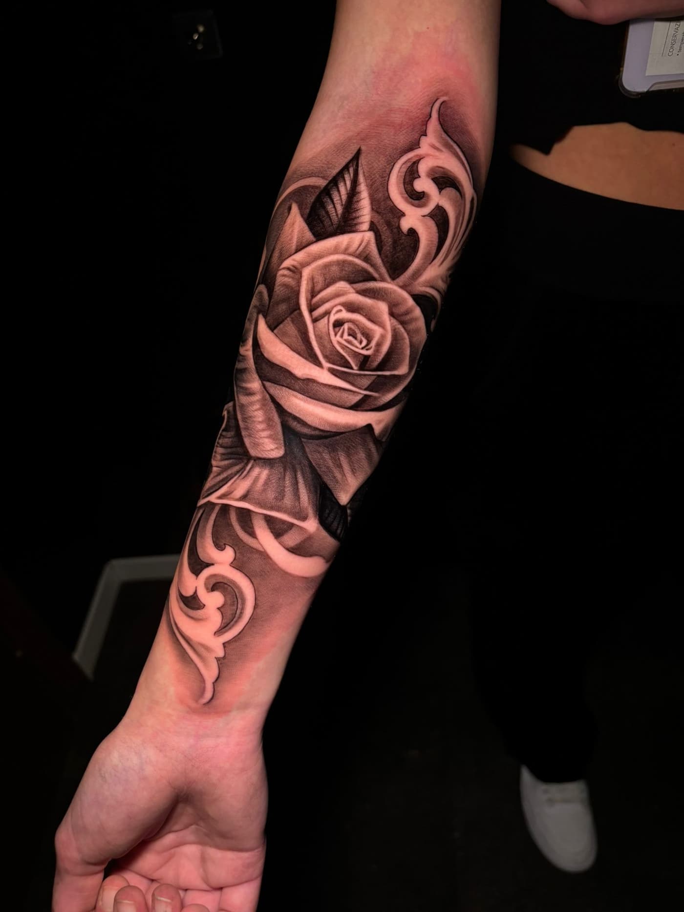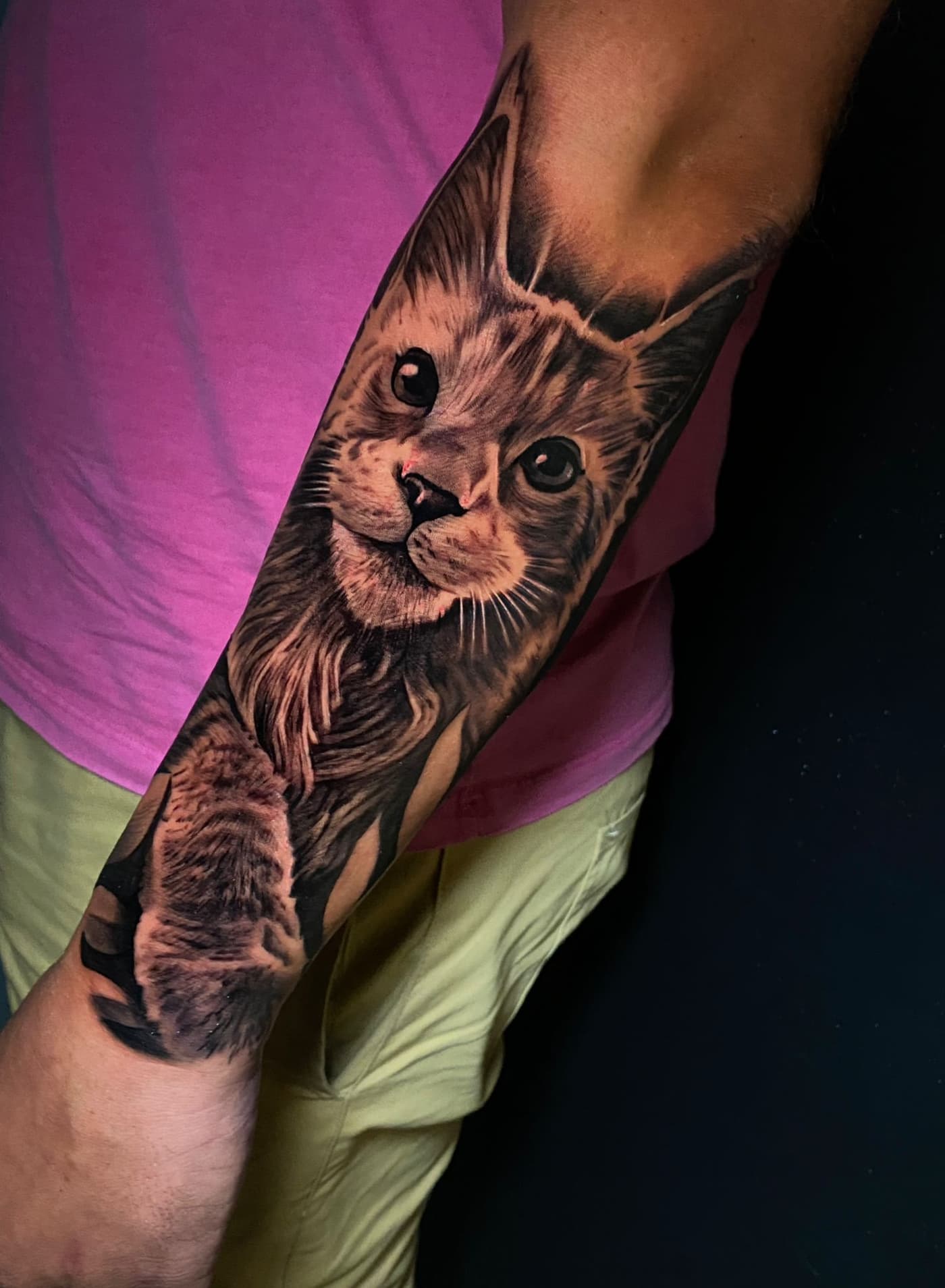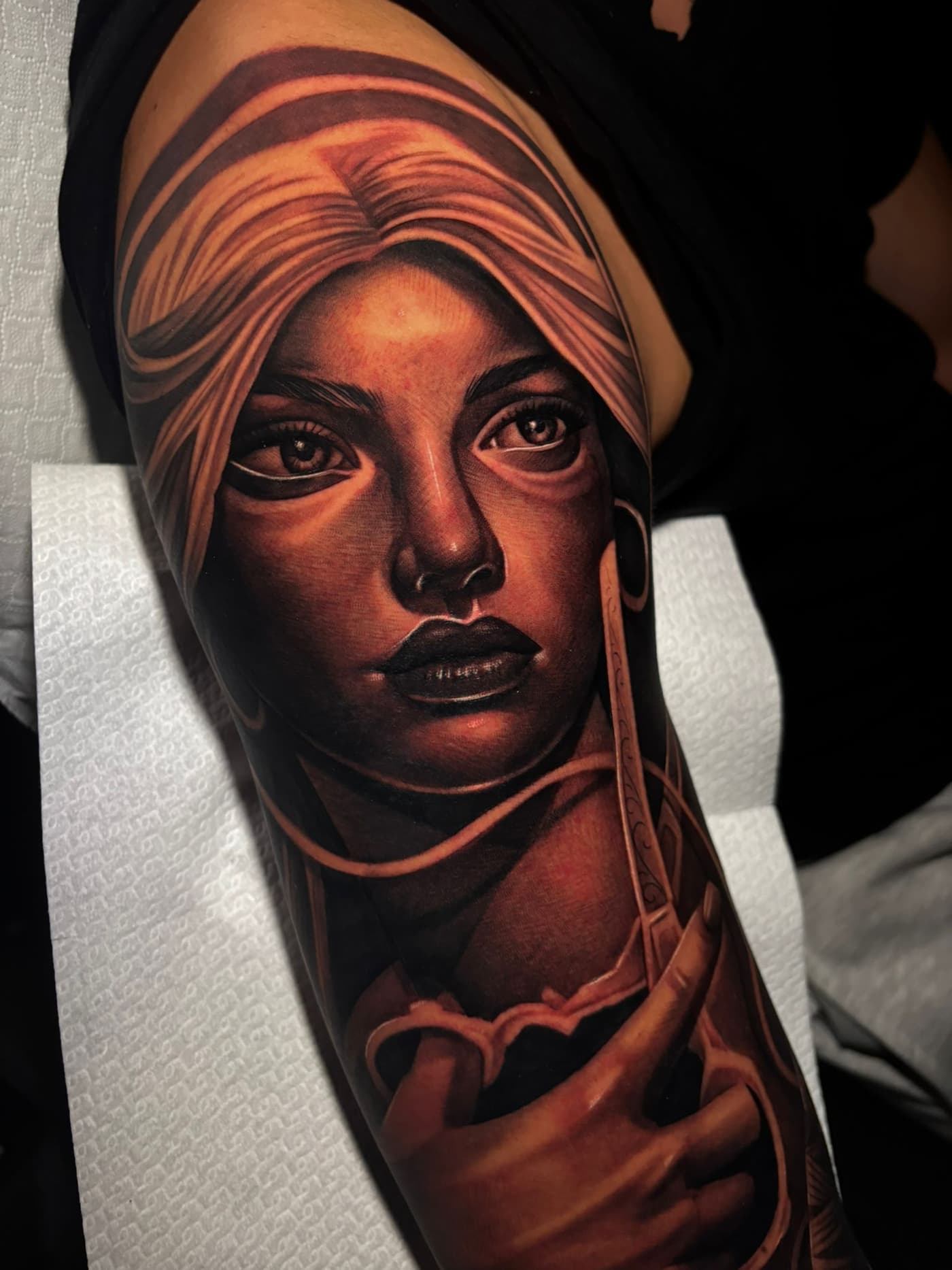 Bevorzugte Stile: Der Künstler bevorzugt Realismus und Tattoos, welche teils verspielten Motive miteinander verbindet.
