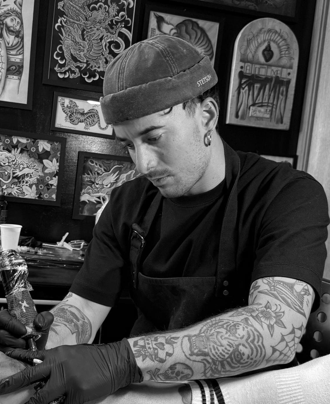 Emiliano verbindet in seiner Arbeit die Ausdrucksstärke klassischer Motive mit einer modernen, feinen Linienführung. Sein Fokus liegt darauf, anatomisch perfekt angepasste Tattoos zu kreieren, die sowohl durch klare Kontraste als auch durch subtile Details überzeugen. Diese Balance zwischen kräftigen Neo-Traditional-Arbeiten und abstrakten, ornamentalen Elementen definiert seine unverkennbare Handschrift.