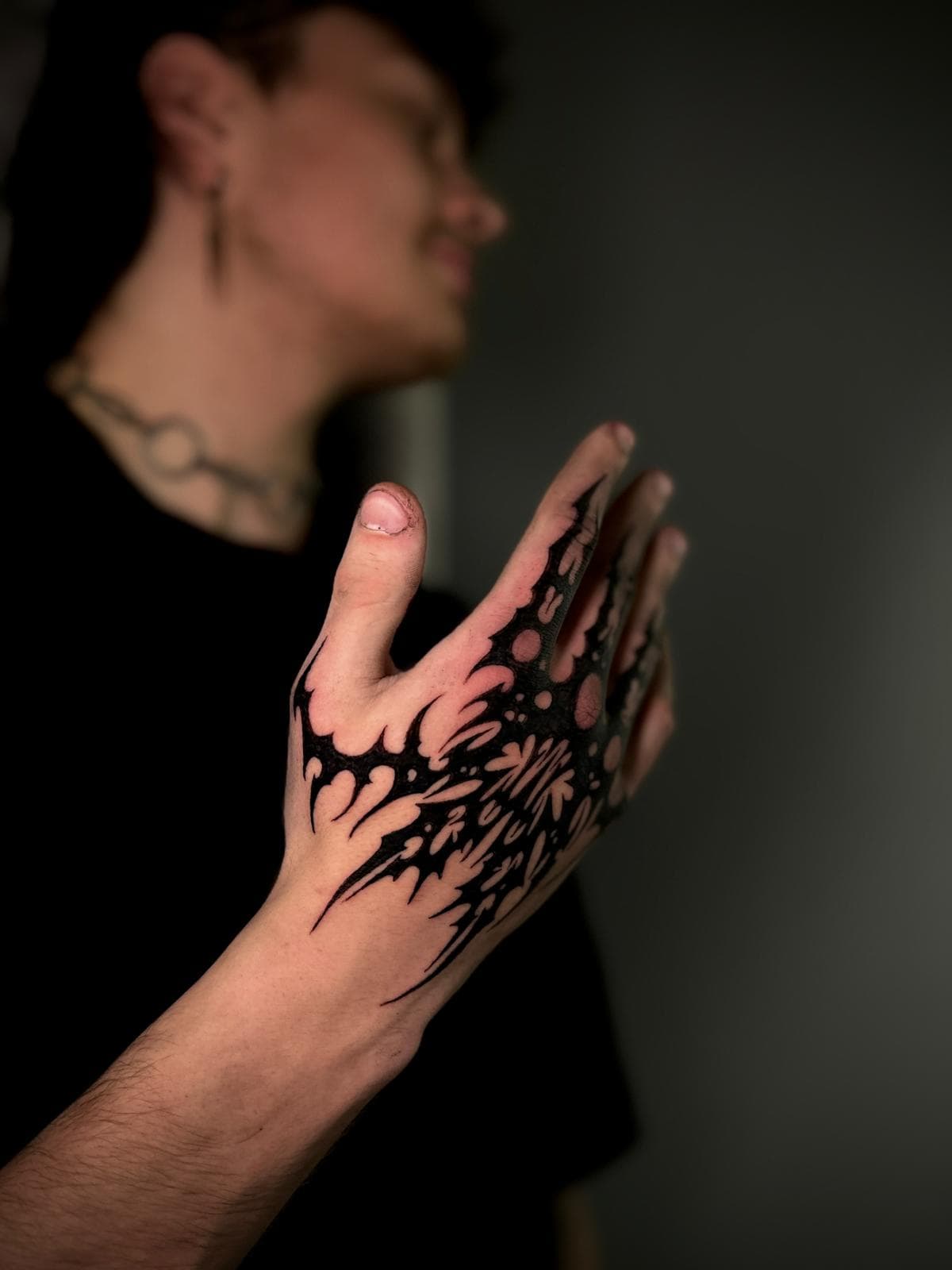 Willkommen auf der Detailseite von Jastice – Seine Tattoos zeichnen sich durch kraftvolle schwarze Flächen und präzise Linien aus, die jedem Motiv eine markante und ausdrucksstarke Wirkung verleihen.