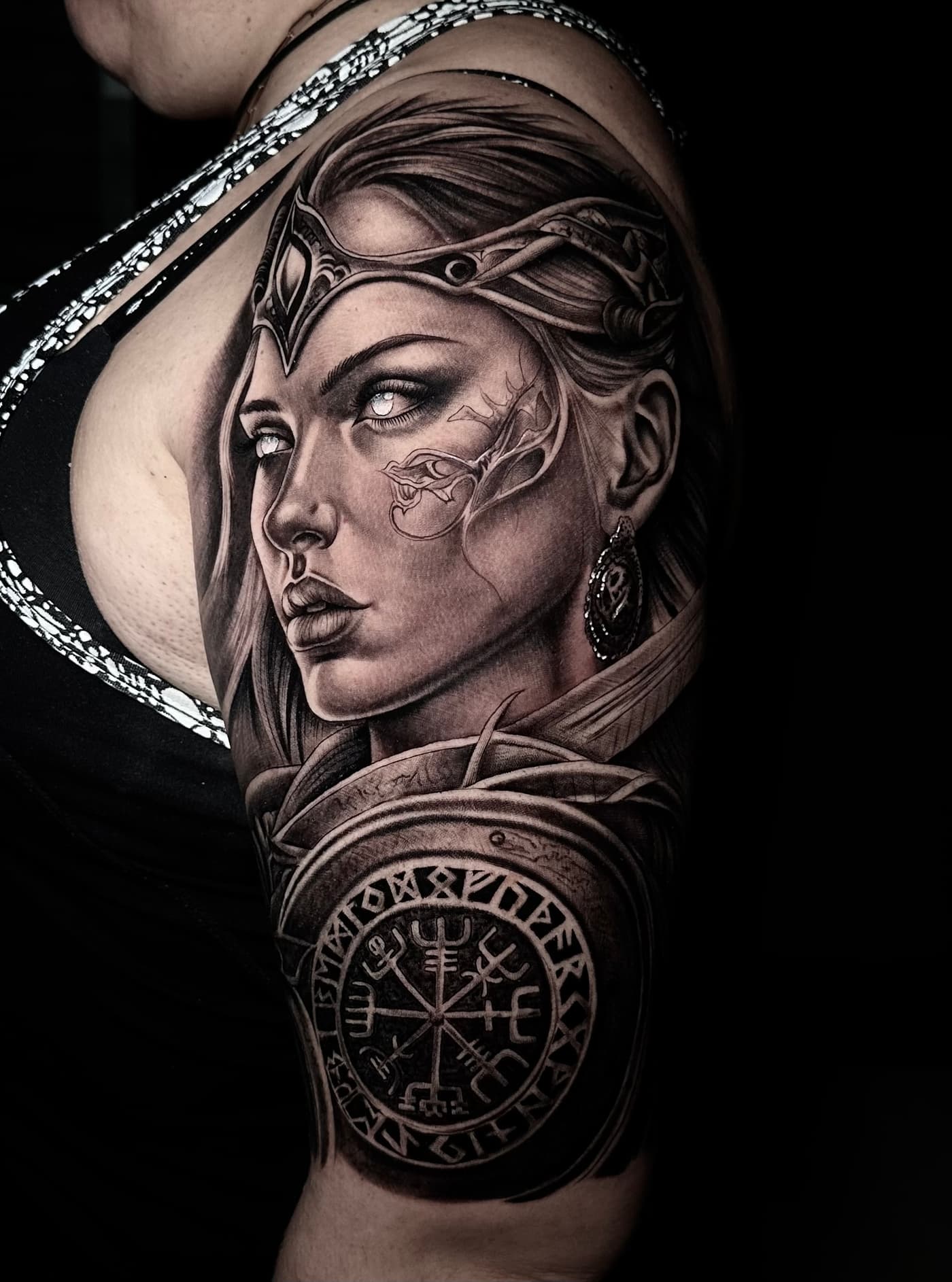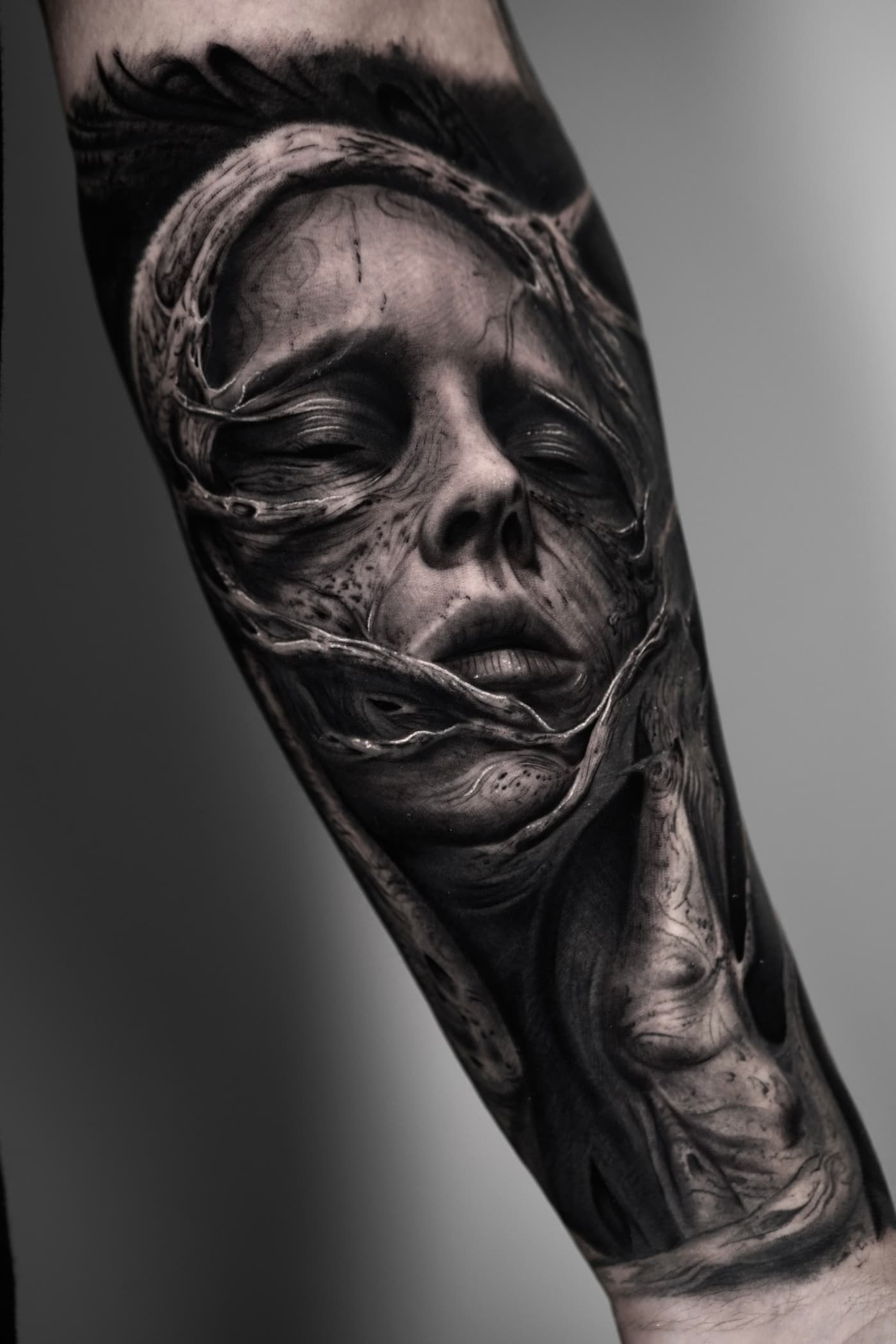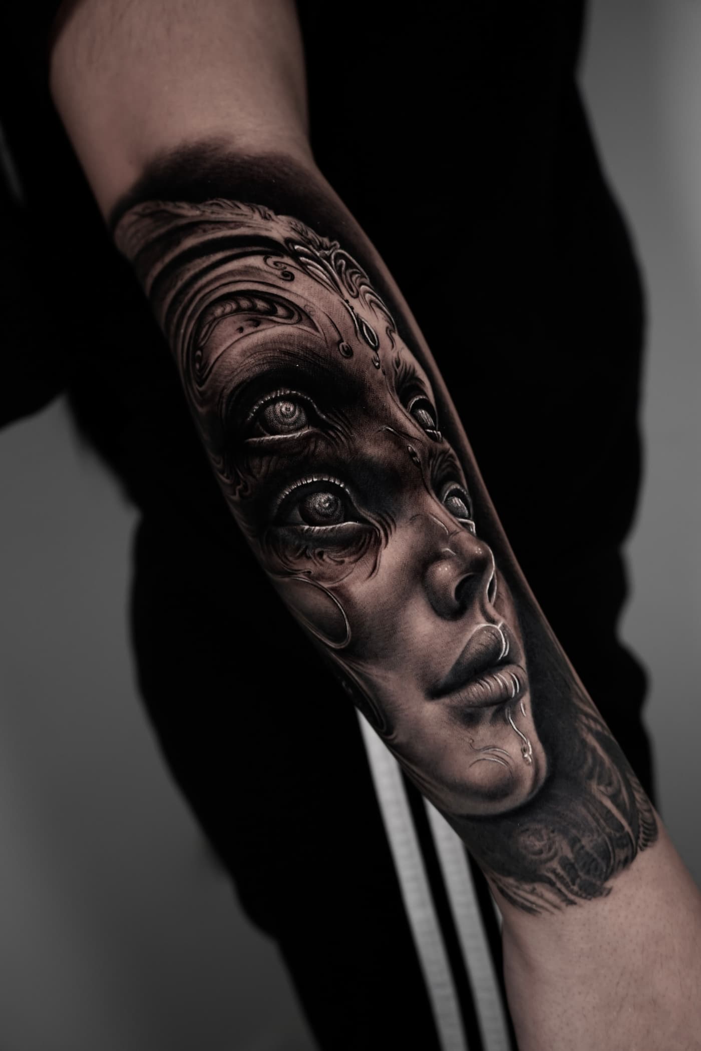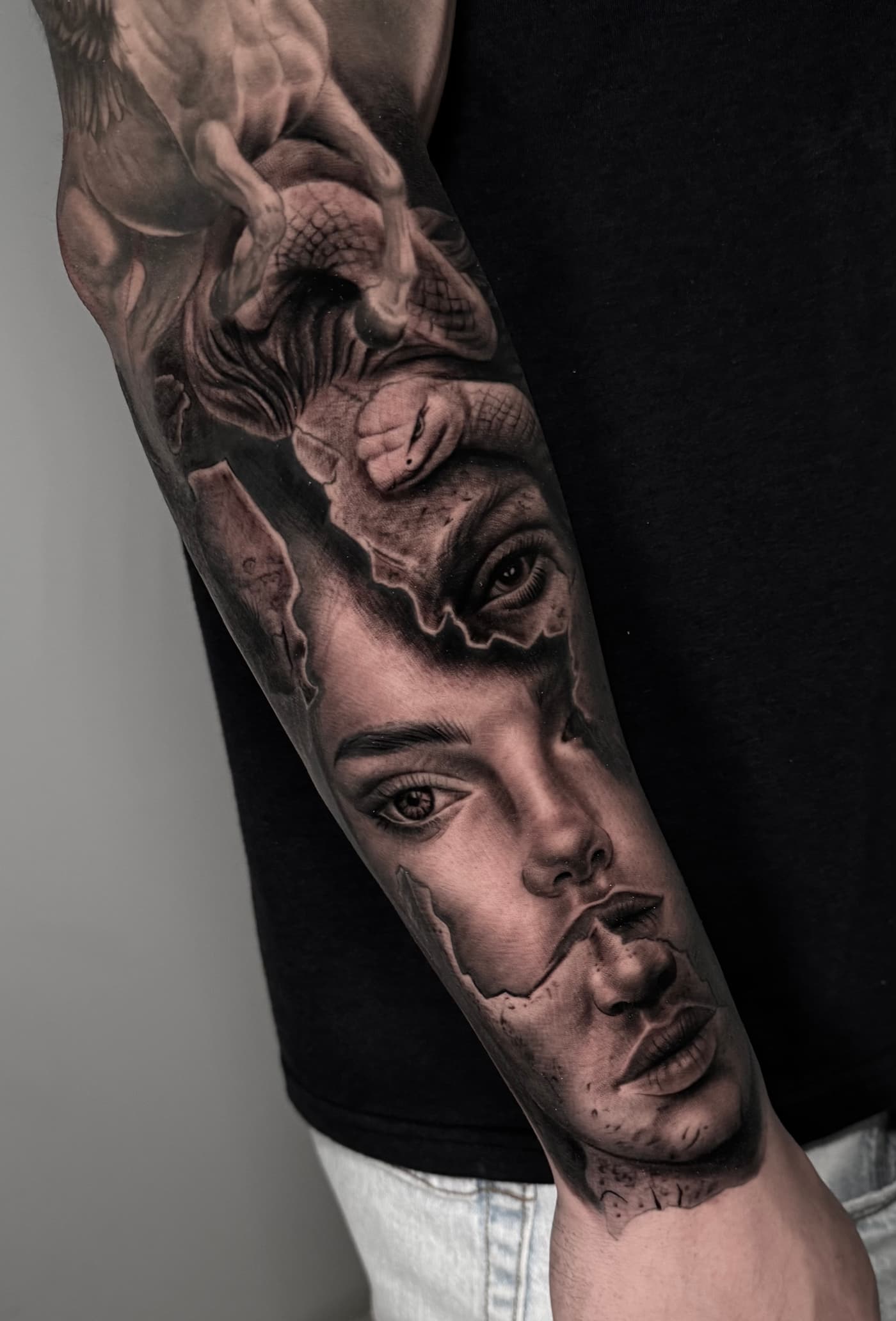 Jeste verbindet klassische Mythologie und Porträts in einer atmosphärischen Black & Grey Ästhetik. Sein Fokus liegt auf einer cineastischen Bildsprache, die durch präzise Schattierungen eine greifbare Plastizität auf der Haut erzeugt.