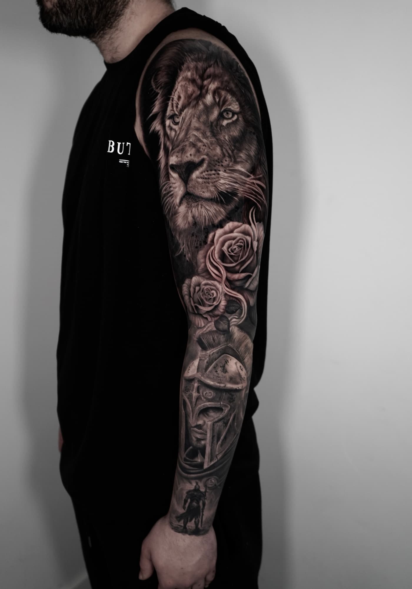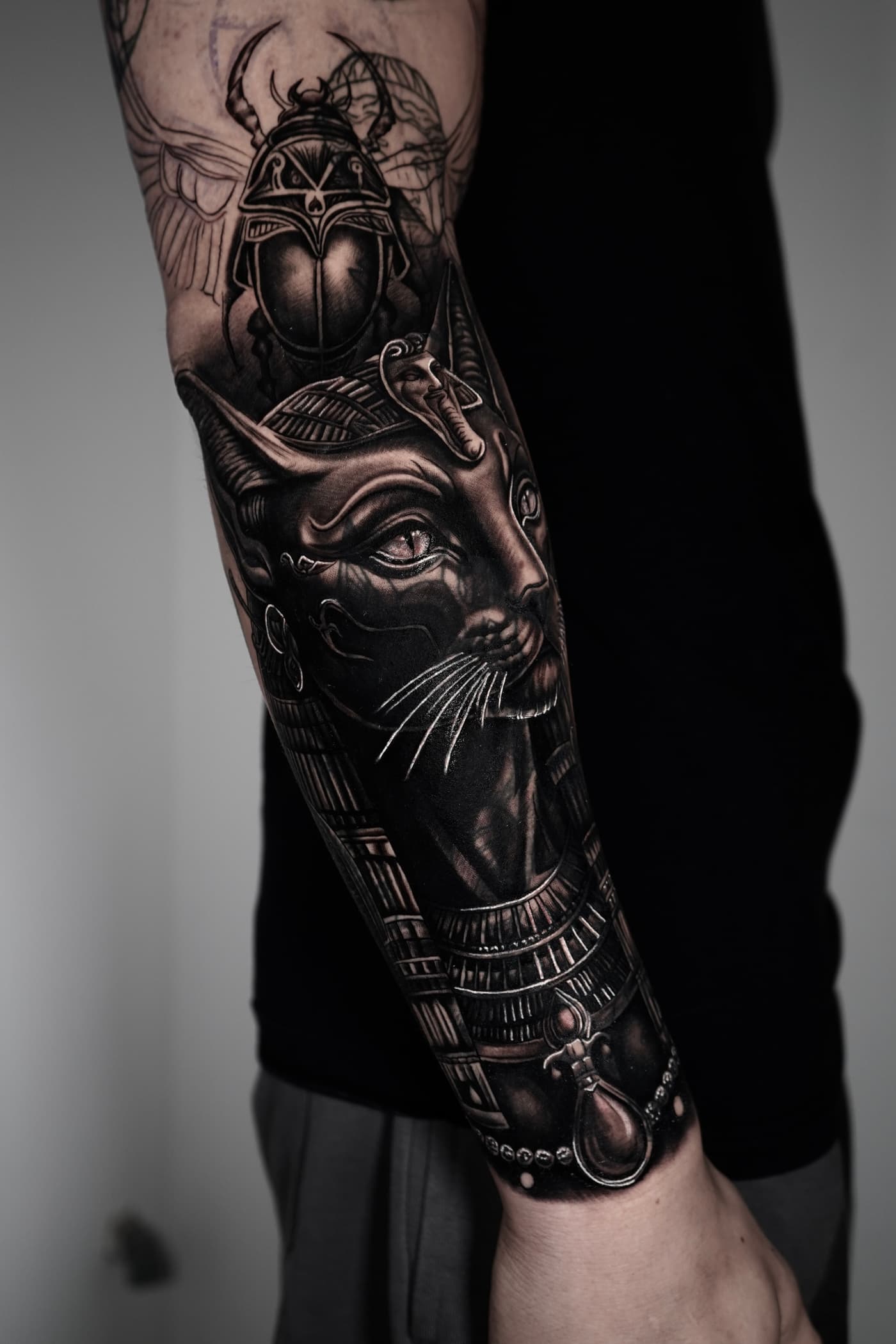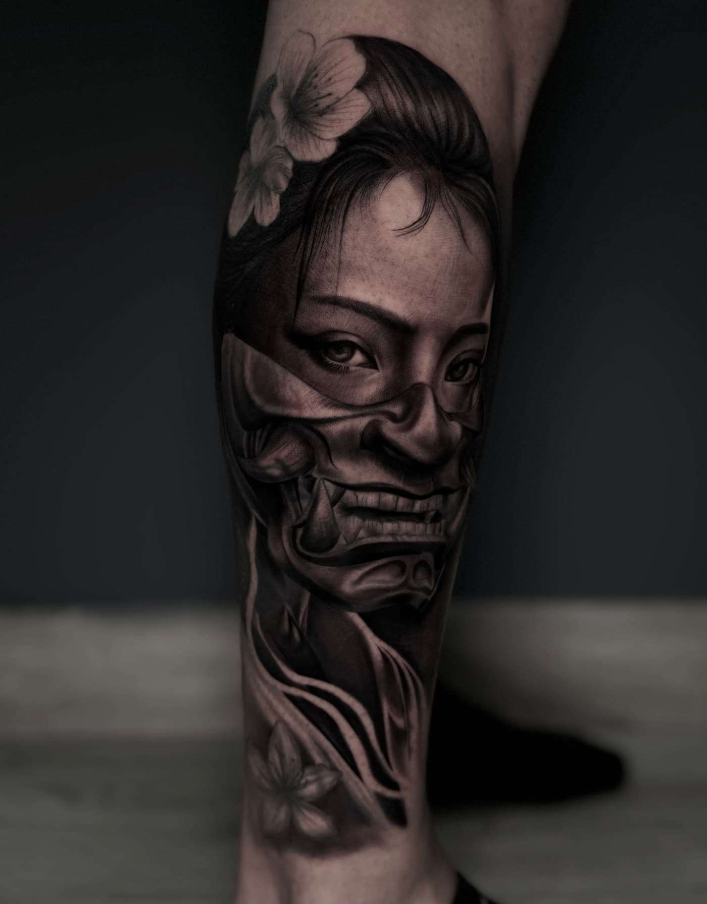 Jeste verbindet klassische Mythologie und Porträts in einer atmosphärischen Black & Grey Ästhetik. Sein Fokus liegt auf einer cineastischen Bildsprache, die durch präzise Schattierungen eine greifbare Plastizität auf der Haut erzeugt.