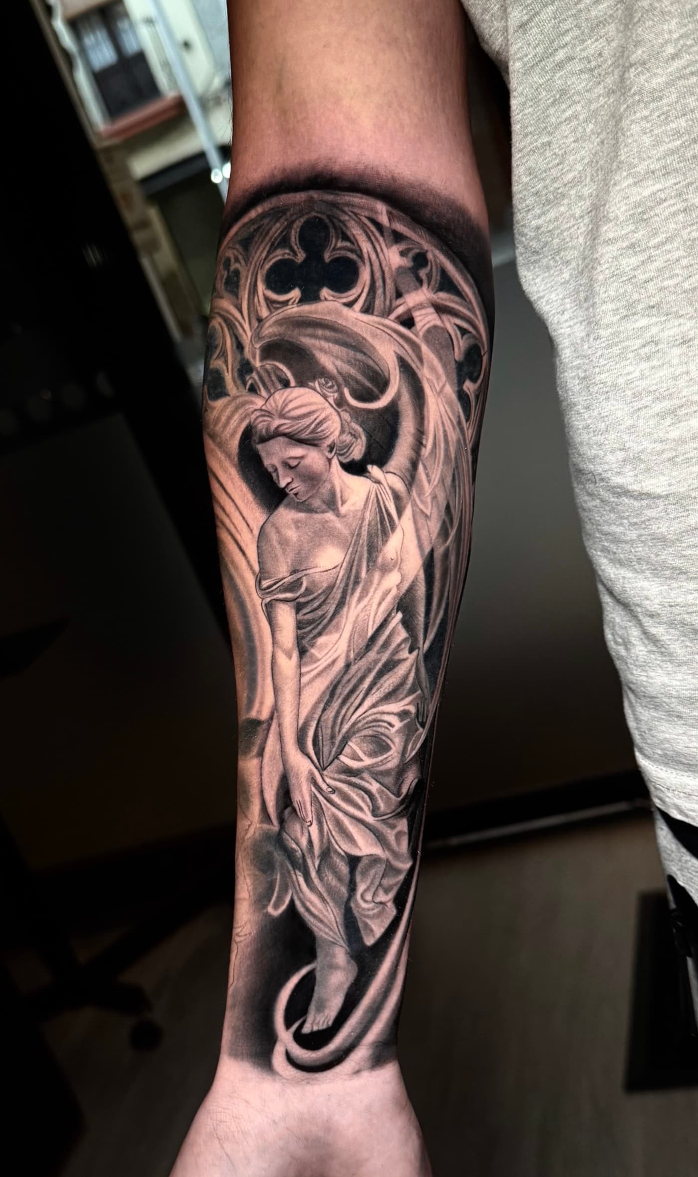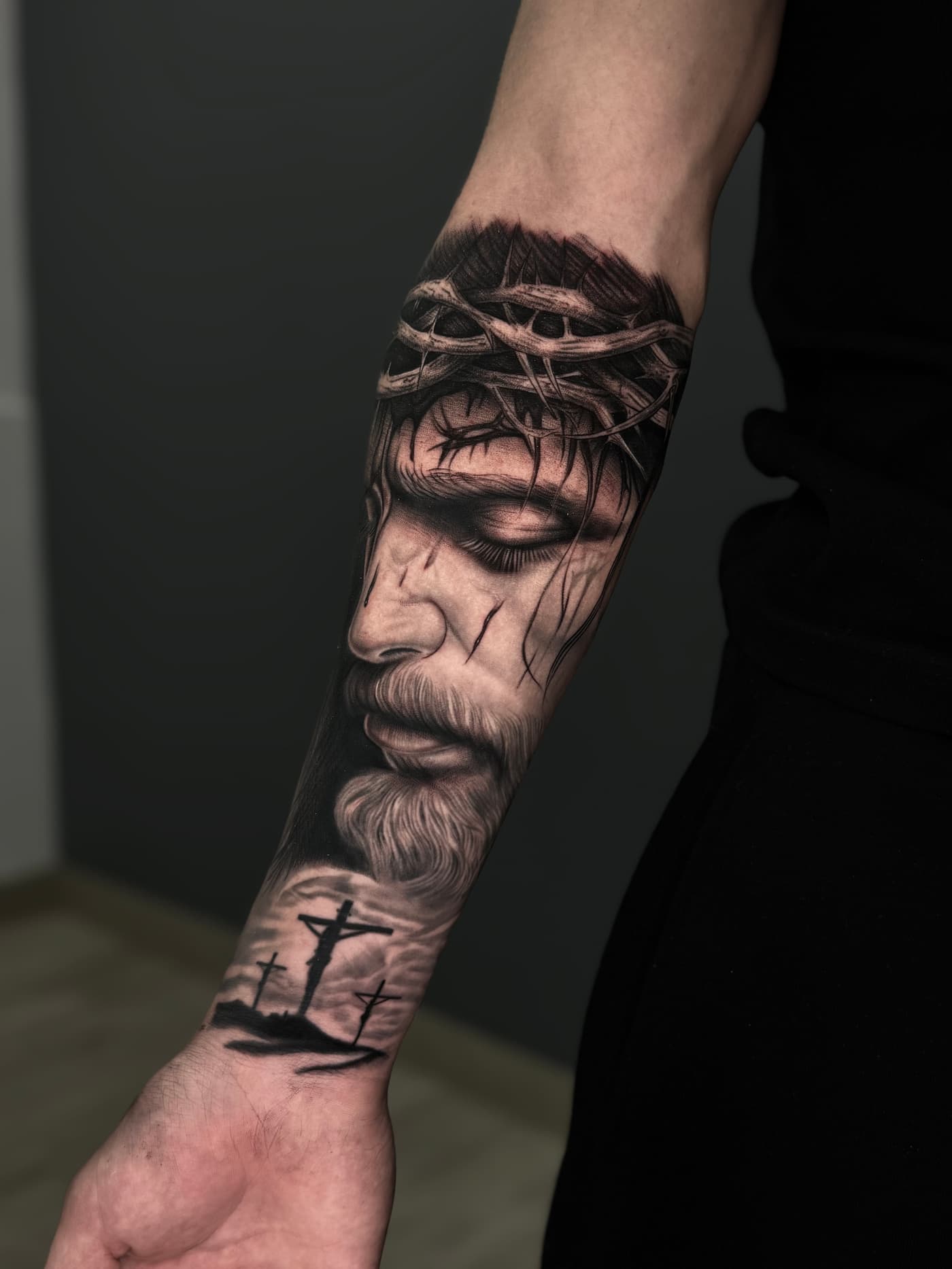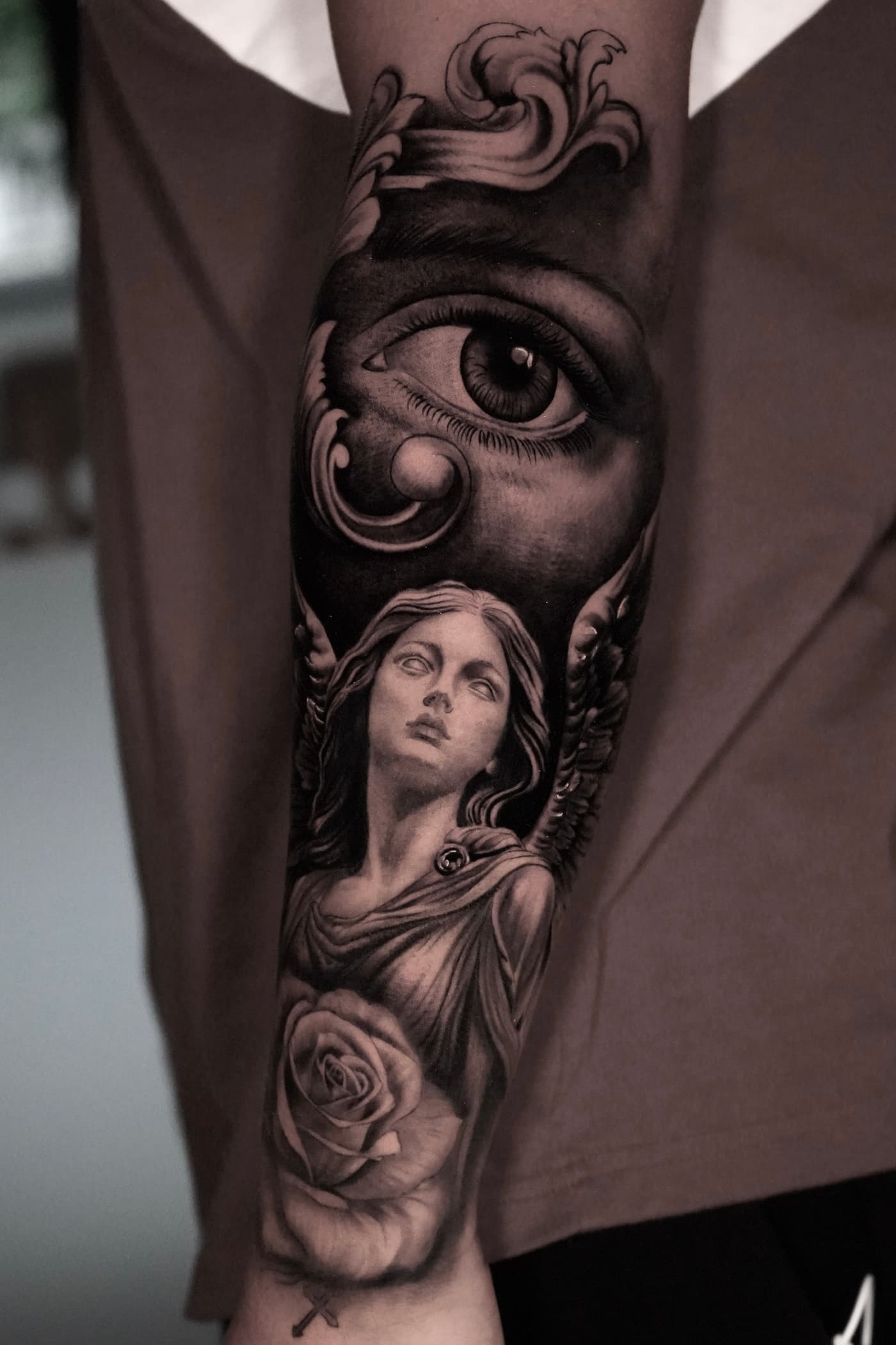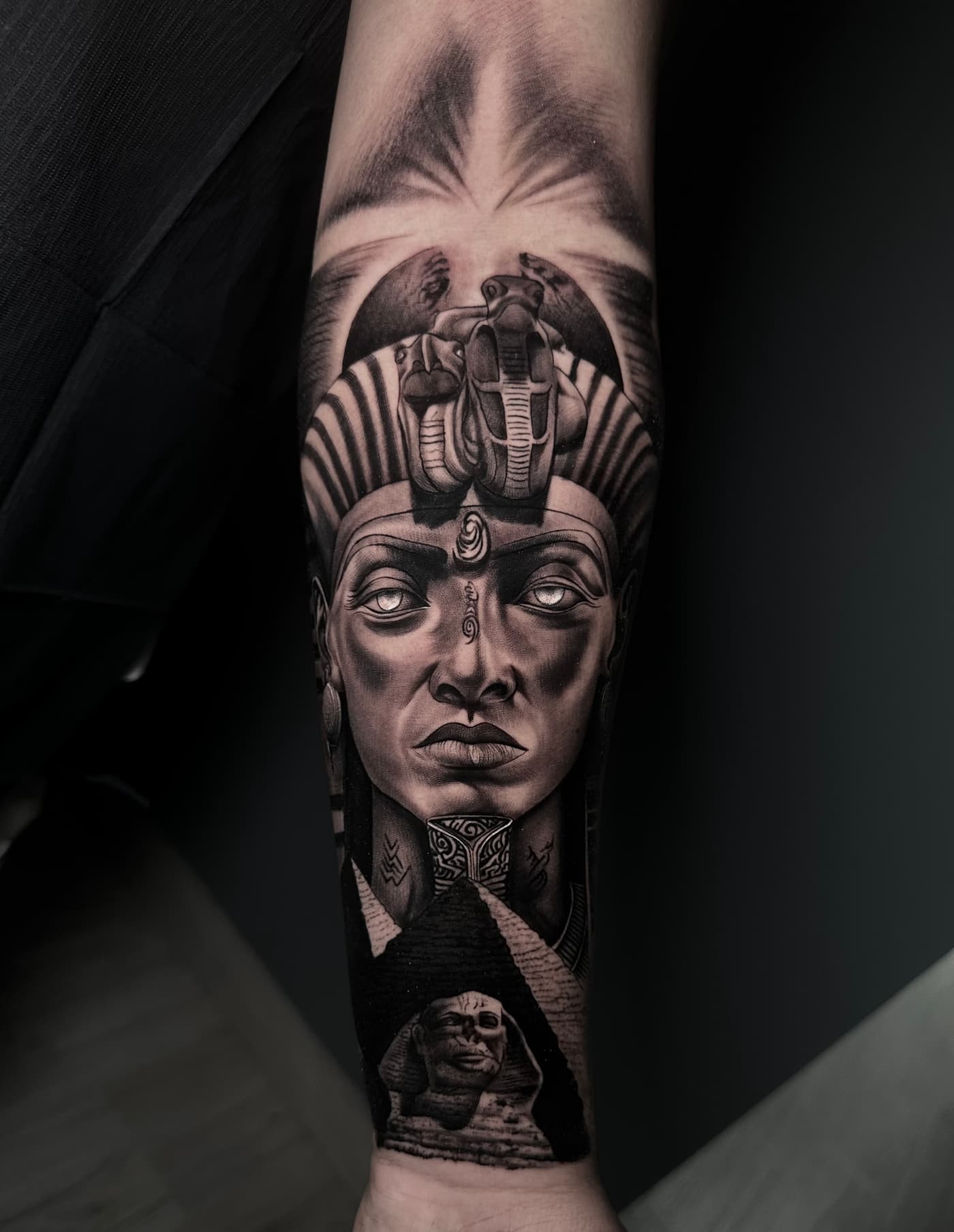Jeste verbindet klassische Mythologie und Porträts in einer atmosphärischen Black & Grey Ästhetik. Sein Fokus liegt auf einer cineastischen Bildsprache, die durch präzise Schattierungen eine greifbare Plastizität auf der Haut erzeugt.