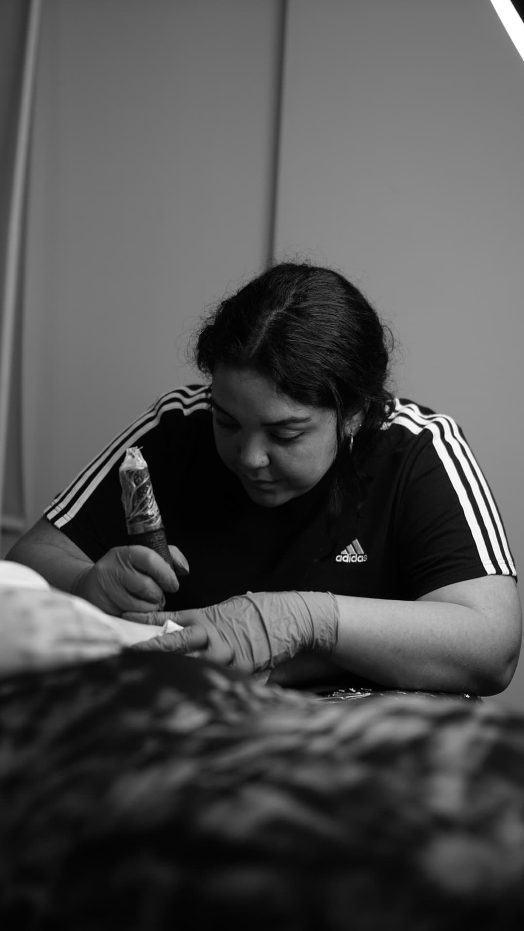 Die technische Stärke von Marian liegt in der extremen Kontrolliertheit seiner Linienführung, die selbst bei komplexen Letterings und filigranen Graphic-Elementen absolute Klarheit bewahrt. Ihre Spezialisierung auf minimalistische Motive erfordert eine fehlerfreie Ausführung, die sie durch jahrelange Erfahrung in der Handhabung feinster Nadelkonfigurationen perfektioniert hat.