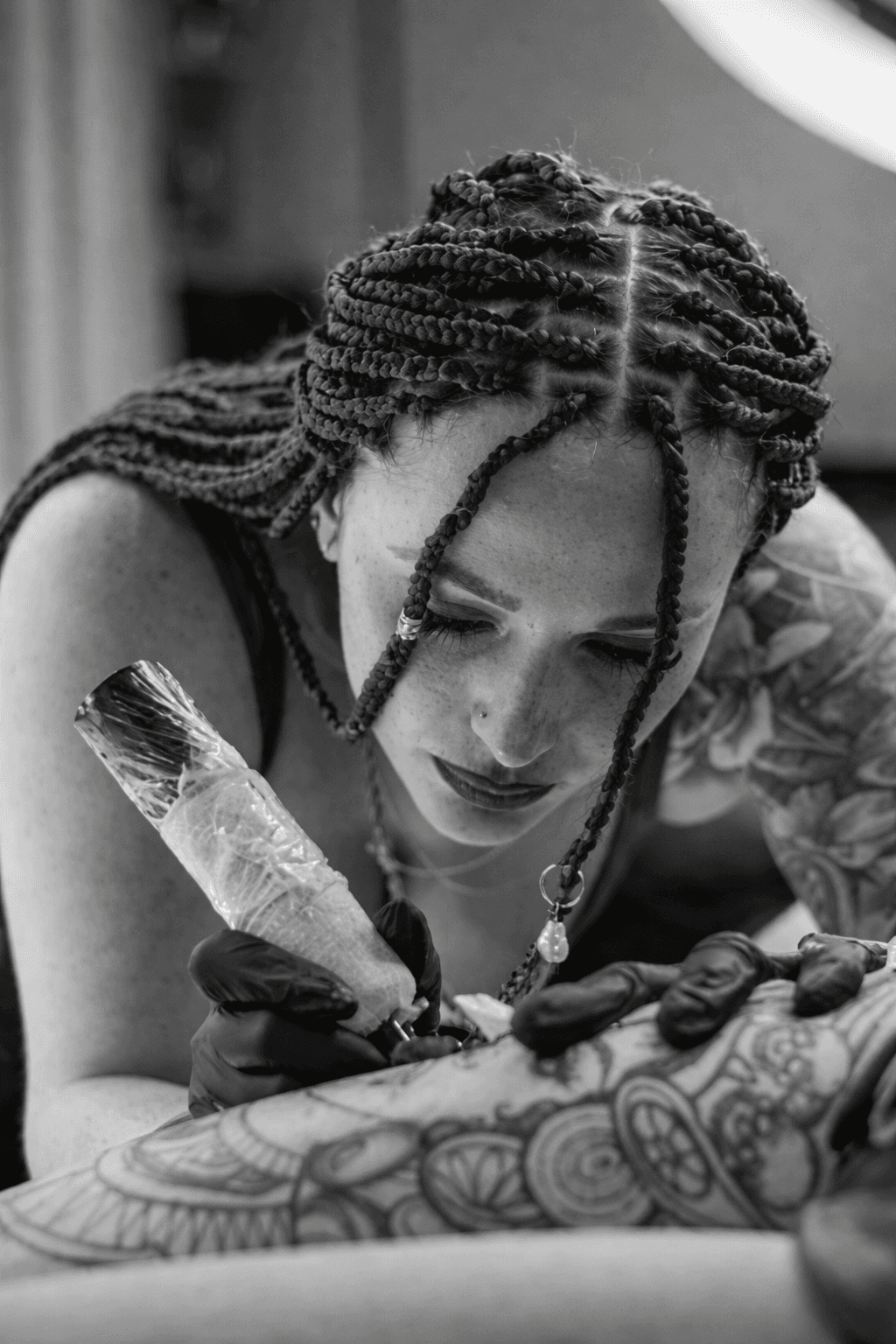 Die Präzision ihrer Nadeldrücke sorgt für extrem feine Konturen und sanfte Schattierungen, die auch langfristig ihre Schärfe behalten. Besonders bei komplexen Floral-Kompositionen und kontrastreichen Blackwork-Flächen zeigt sich ihr technisches Verständnis für Tiefe und Haltbarkeit.