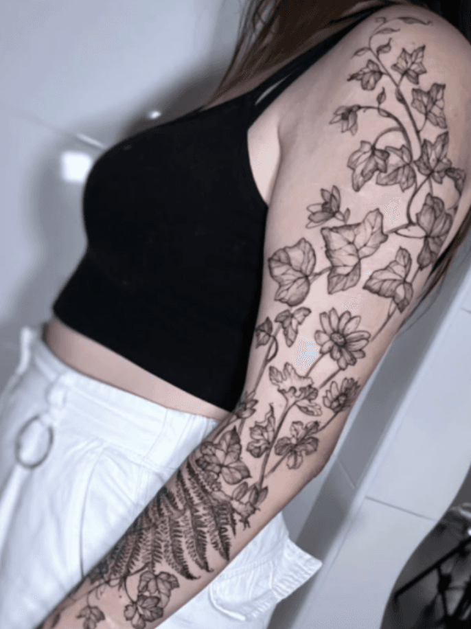 Willkommen auf der Detailseite von Xenia – Ihre Tattoos zeichnen sich durch beeindruckenden Präzision im mit schwarzer Farbe aus.