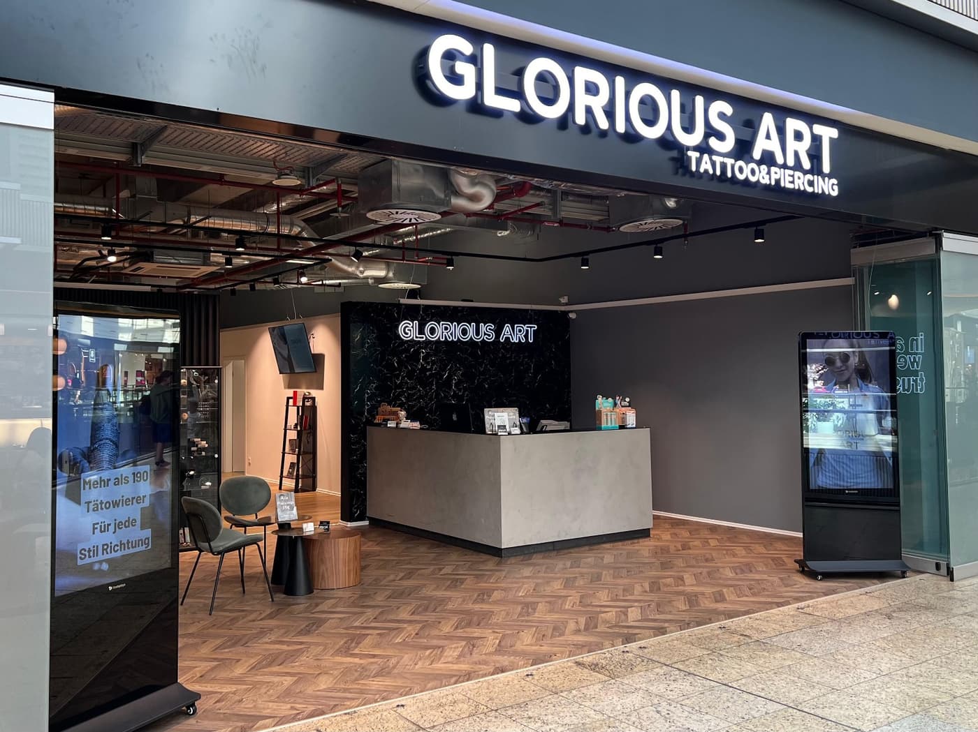 Unsere Studios bieten eine einladende Atmosphäre, großzügige Wartebereiche und eine breite Auswahl an Tattoo- und Piercing-Dienstleistungen.