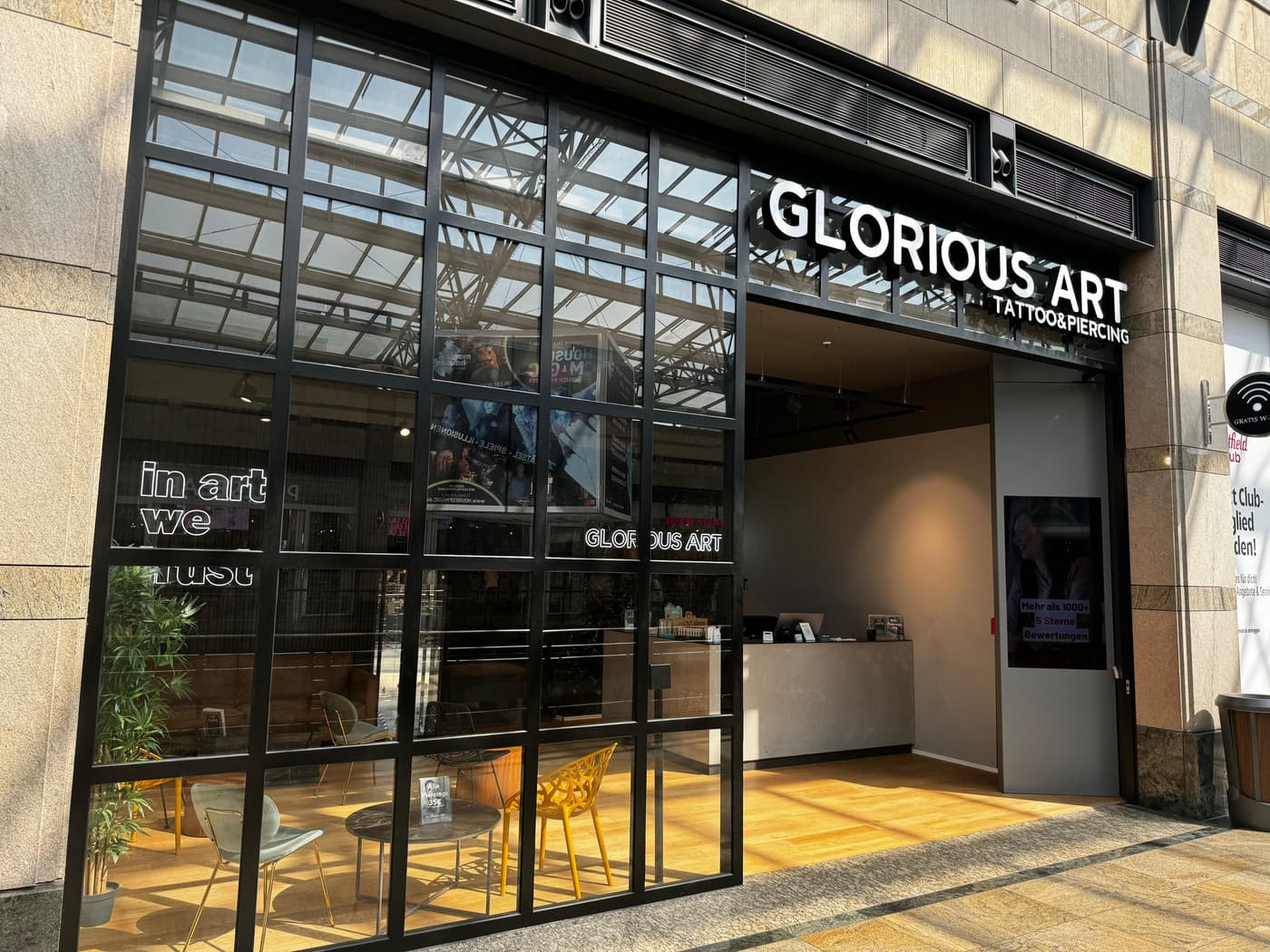 Unsere Studios bieten eine einladende Atmosphäre, großzügige Wartebereiche und eine breite Auswahl an Tattoo- und Piercing-Dienstleistungen.